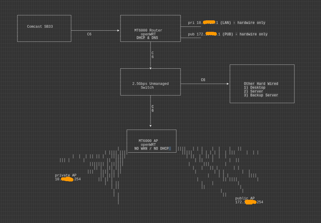 This tutorial reviews the unique manner in which I was able to get public and private interfaces/subnets/vlans set up on two GL.Inet MT6000s. One device is used as the router and has WiFi setup for emergencies, an openvpn server for external access, and public and private lan interfaces/subnets/vlans. The other device is in AP-only mode and only has the public and private lan interfaces/subnets/vlans. I’ll call the first device the router and the second device the AP. The AP is centrally located in the house and has a cat6 that is fed to it from across the house where the primary wiring distribution is. The router has incoming DOCSIS cable internet from an Arris SB33 at 1200 Gbps and feeds into a 2.5Gbps WAN port on the router. The router then feeds a cat6 cable out of its 2.5Gbps LAN port into a 2.5Gbps switch, and from there to all remaining hardwired servers, devices, including into the AP device’s 2.5Gbps LAN port. Fun ASCII drawing below.